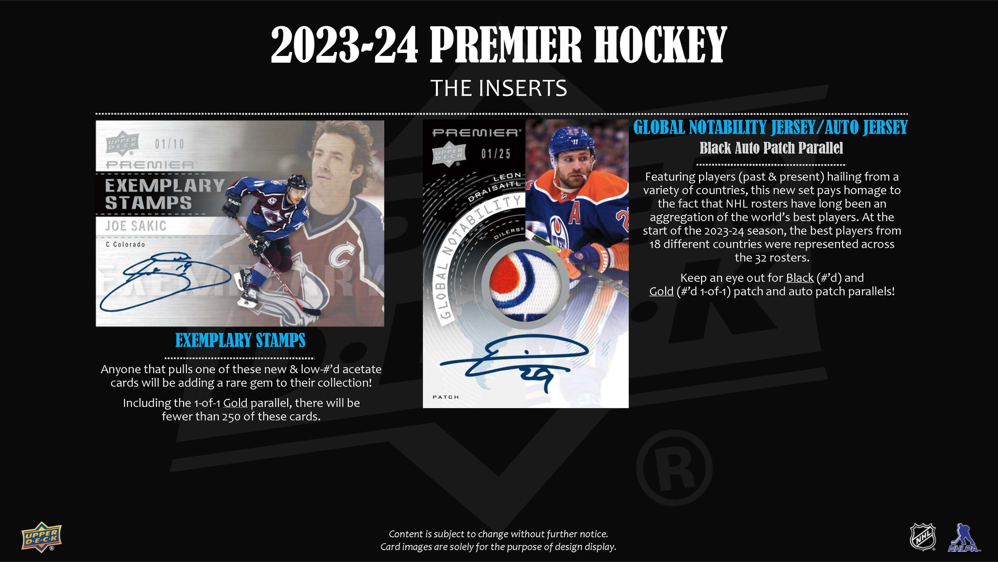 Premier is well-known for its multi-memorabilia and extra-large premium memorabilia cards and the 2023-24 edition is no exception! The multi-memorabilia offerings include the popular Premier Gear Jersey, Patch and Tag/Button sets, the Premier Dual, Triple and Quad Jersey sets, and the Premier Dual, Triple and Quad Patch sets - all of which are low-numbered and feature star veterans and top rookies. The extra-large premium memorabilia offering includes the low-numbered Premier Mega Patch (Chest Logo, Sleeve Number, Shoulder Logo and Commemorative Logo) sets featuring star veterans, and the low-numbered rookie equivalent: Rookie Patch-Taculars (Chest Logo, Shoulder Logo and Logo Patch). And of course, there are sets that feature multiple extra-large premium memorabilia swatches - the star veteran Premier Mega Patch Duos, Trios and Quads, and the Dual Rookie Patch-Taculars (Chest Logos, Shoulder Logos and Logo Patch)!