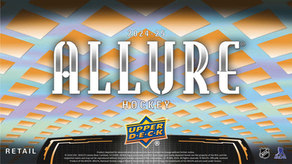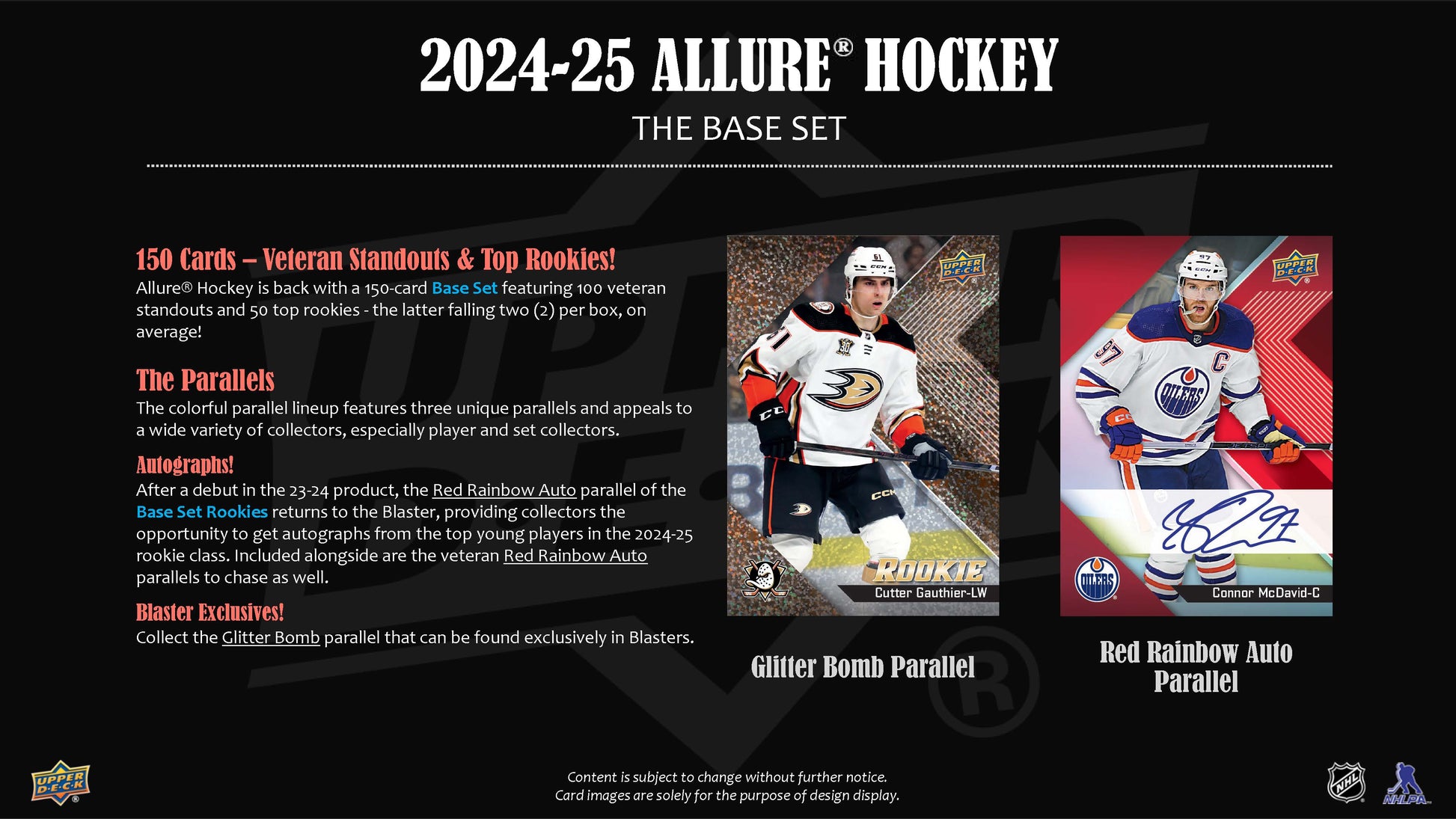 THE BASE SET: Allure® Hockey returns with a 150-card Base Set consisting of 100 veteran standouts and 50 rookies - the latter falling 2 per box, on average. From the popular Black Rainbow, Red Rainbow and Orange Slice parallels to the Blaster-exclusive Glitter Bomb parallel, the parallel lineup appeals to a wide variety of collectors, especially player and set collectors.