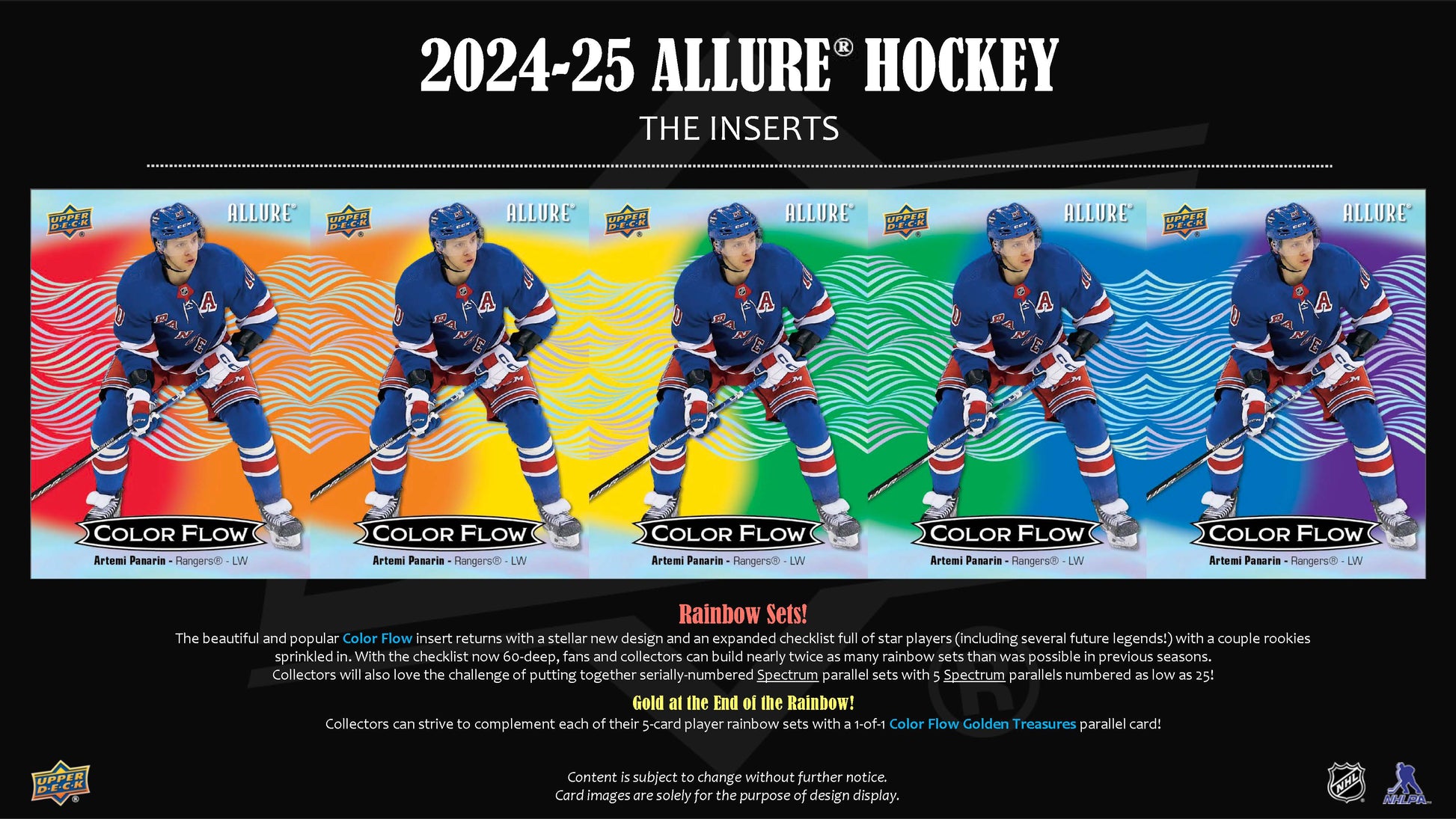 - Gold at the End of the Rainbow! Collectors can strive to complement each of their five-card rainbow sets with a 1-of-1 Color Flow - Golden Treasures card!