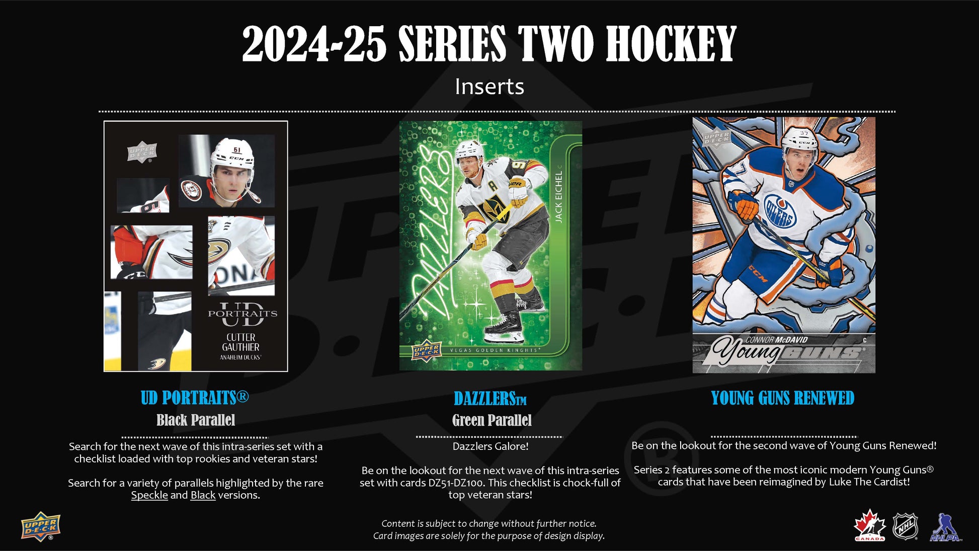 Series 2 sports the next 250 cards of the 2024-25 Upper Deck Base Set. Annually, the Upper Deck Base Set is the most widely-collected Base Set in hockey. It includes 198 veteran cards, 49 Young Guns® rookie cards and three checklist cards. The iconic Young Guns® are the most anticipated rookie cards of the season.