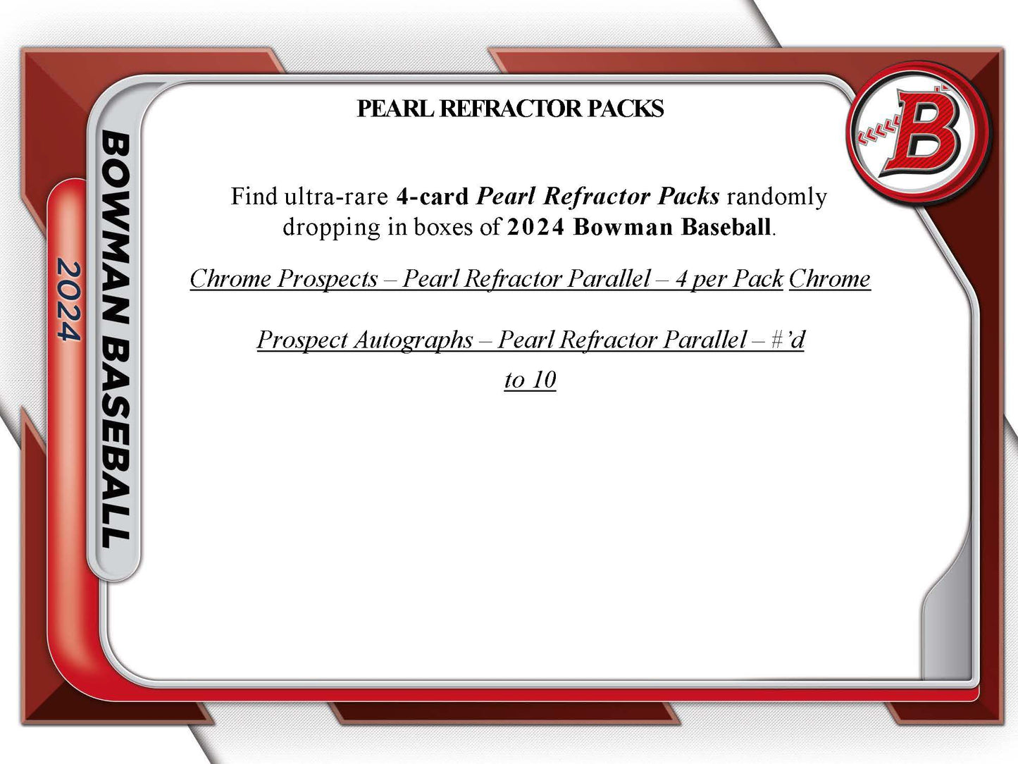 Find ultra-rare 4-card Pearl Refractor Packs randomly dropping in boxes of 2024 Bowman Baseball.