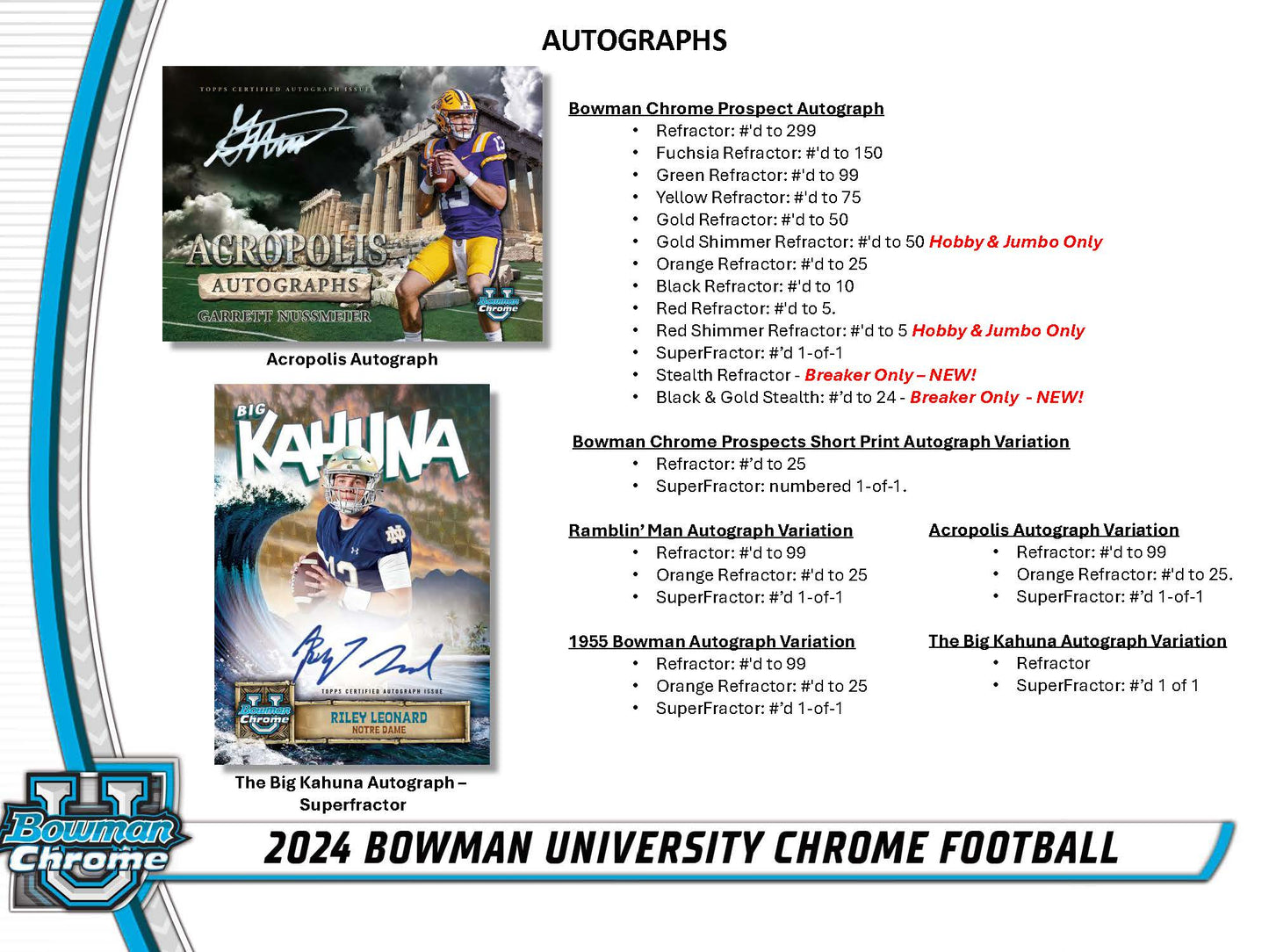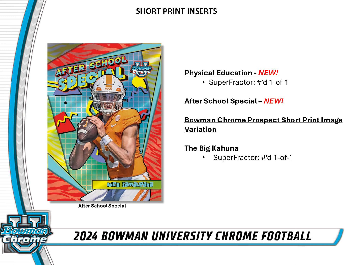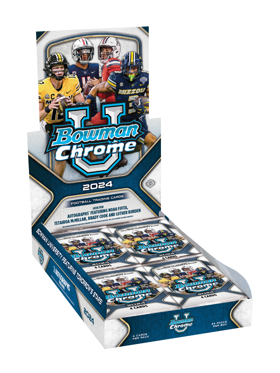 Get ready to storm the field, Bowman University Chrome Football is back for the 2024 College Football season! Look for the top prospects across the nation, with their very first Bowman Cards!