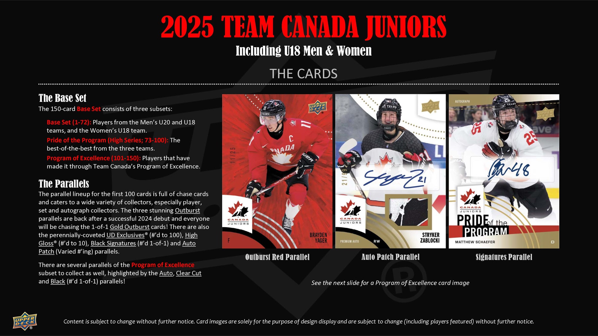The parallel lineup for the first 100 cards is full of chase cards and caters to a wide variety of collectors, especially player, set and autograph collectors. The three stunning Outburst parallels are back after a successful 2024 debut and everyone will be chasing the 1-of-1 Gold Outburst cards! There are also the perennially-coveted UD Exclusives® (#’d to 100), High Gloss® (#’d to 10), Black Signatures (#’d 1-of-1) and Auto Patch (Varied #’ing) parallels.