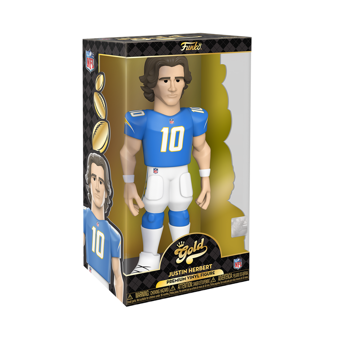 Score a touchdown for your National Football League collection with the new Funko GOLD™ 12” NFL Justin Herbert from the Los Angeles Chargers. This 12-inch tall collectible of Justin Herbert has him dressed in his powder blue jersey. GOLD is the perfect way to commemorate some of your favourite NFL players in your collection, and each figure comes in a sleek, display-ready box that is easy to stack with other GOLD