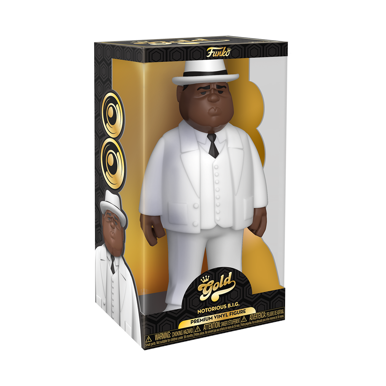 Go for Gold in your music collection with the new Funko Gold Notorious B.I.G. premium vinyl figure. Notorious B.I.G. is dressed to the nines in his white suit for this 12-inch tall collectible. Gold is the perfect way to commemorate some of your favourite, iconic music artists in your collection, and each figure comes in a sleek, display-ready box that is easy to stack with other Gold collectibles. Vinyl figure is 12-inches tall.